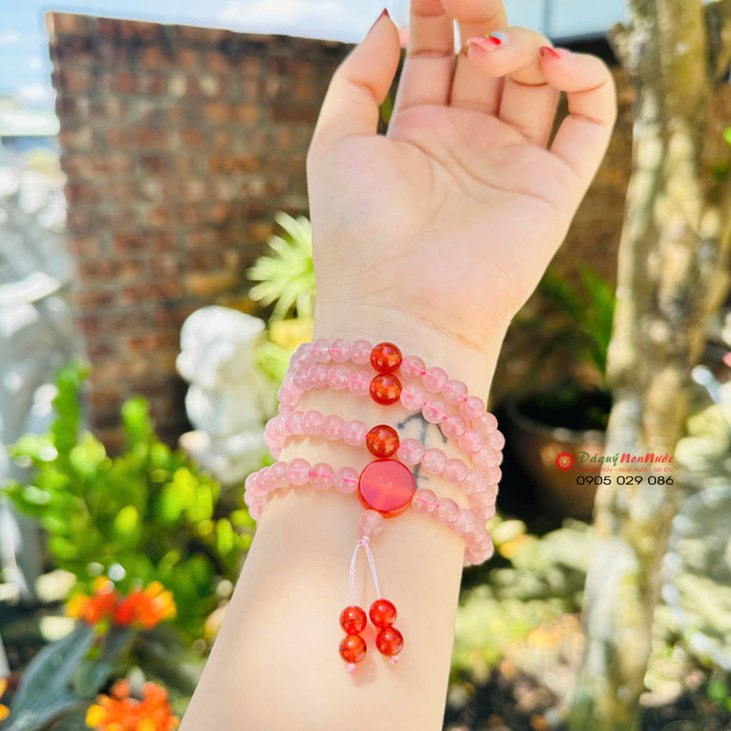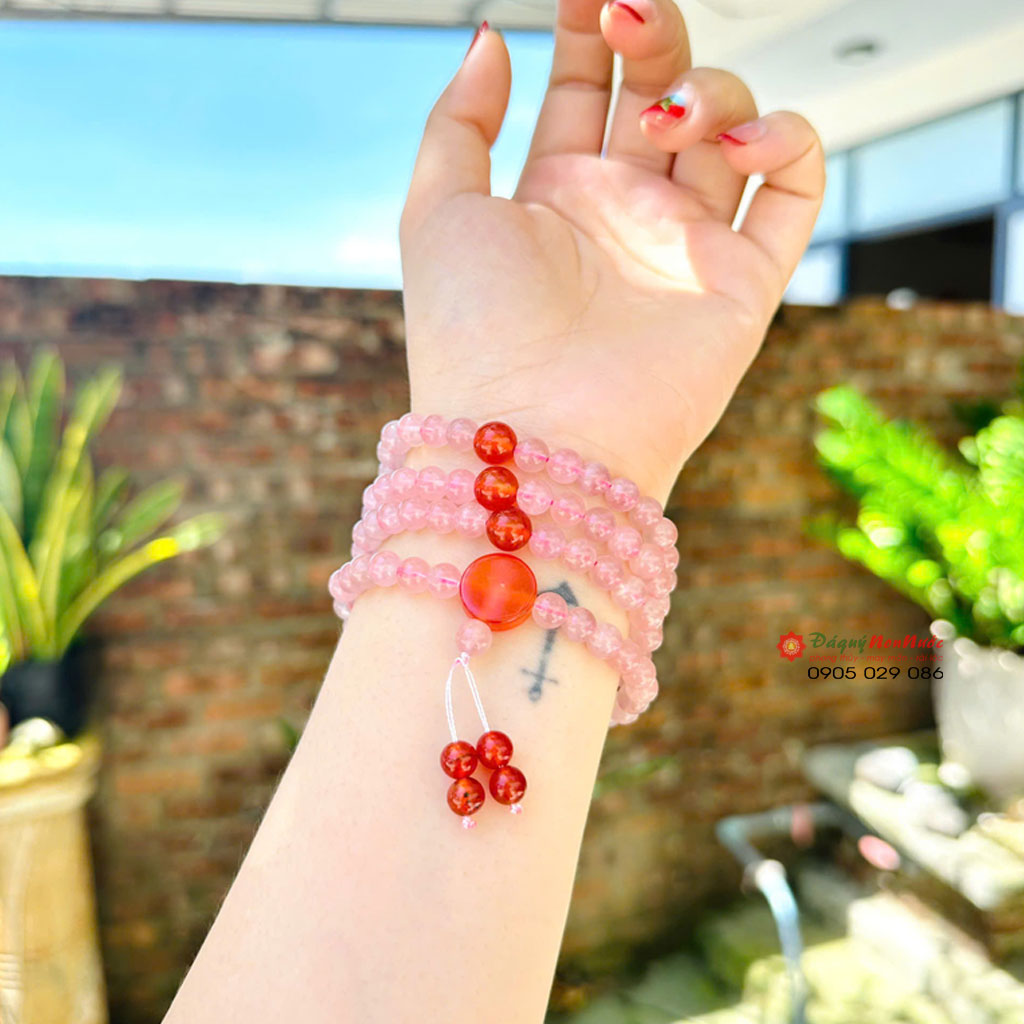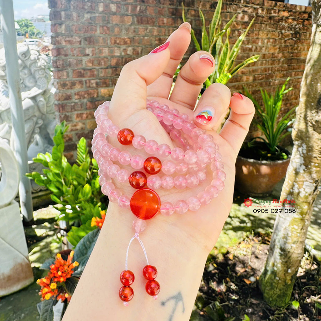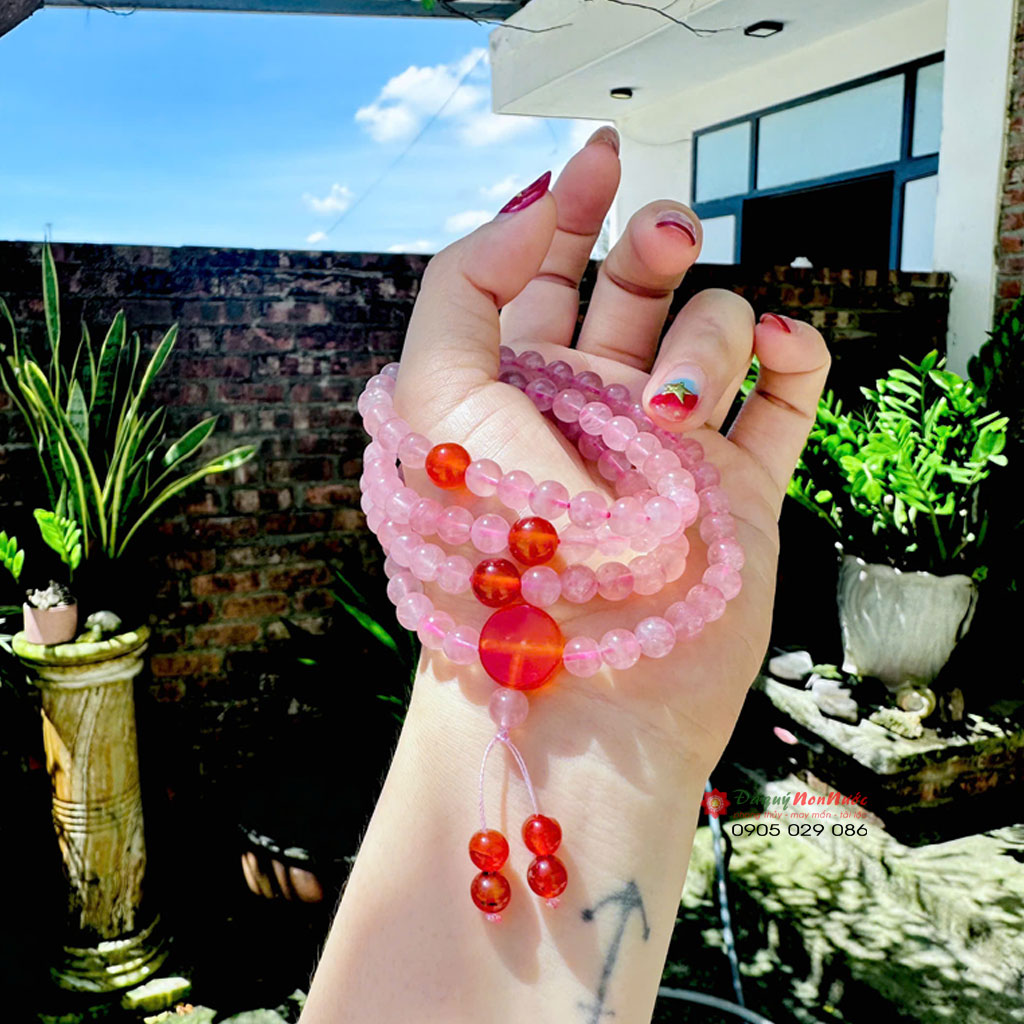 Chuỗi thạch anh hồng 108 hạt được chế tác thủ công, có thể tùy chỉnh theo kích thước cổ tay và nhu cầu phong thủy cá nhân. Giao hàng toàn quốc – kiểm tra hàng trước khi thanh toán – cam kết chất lượng từ đá tự nhiên nguyên khối.