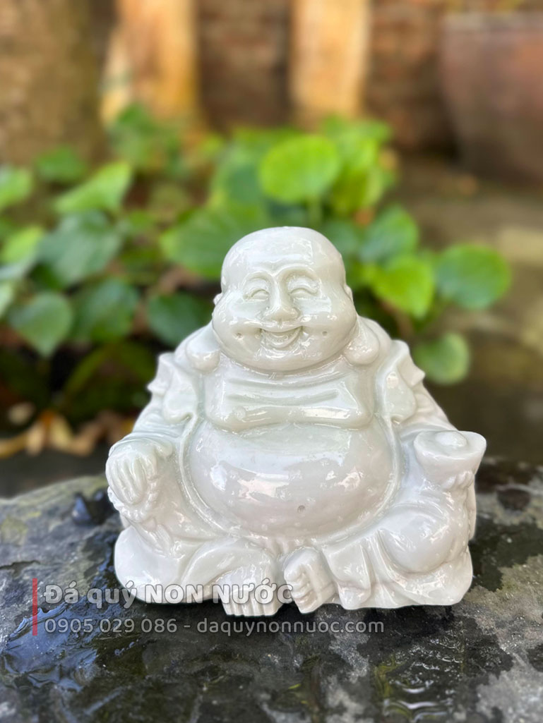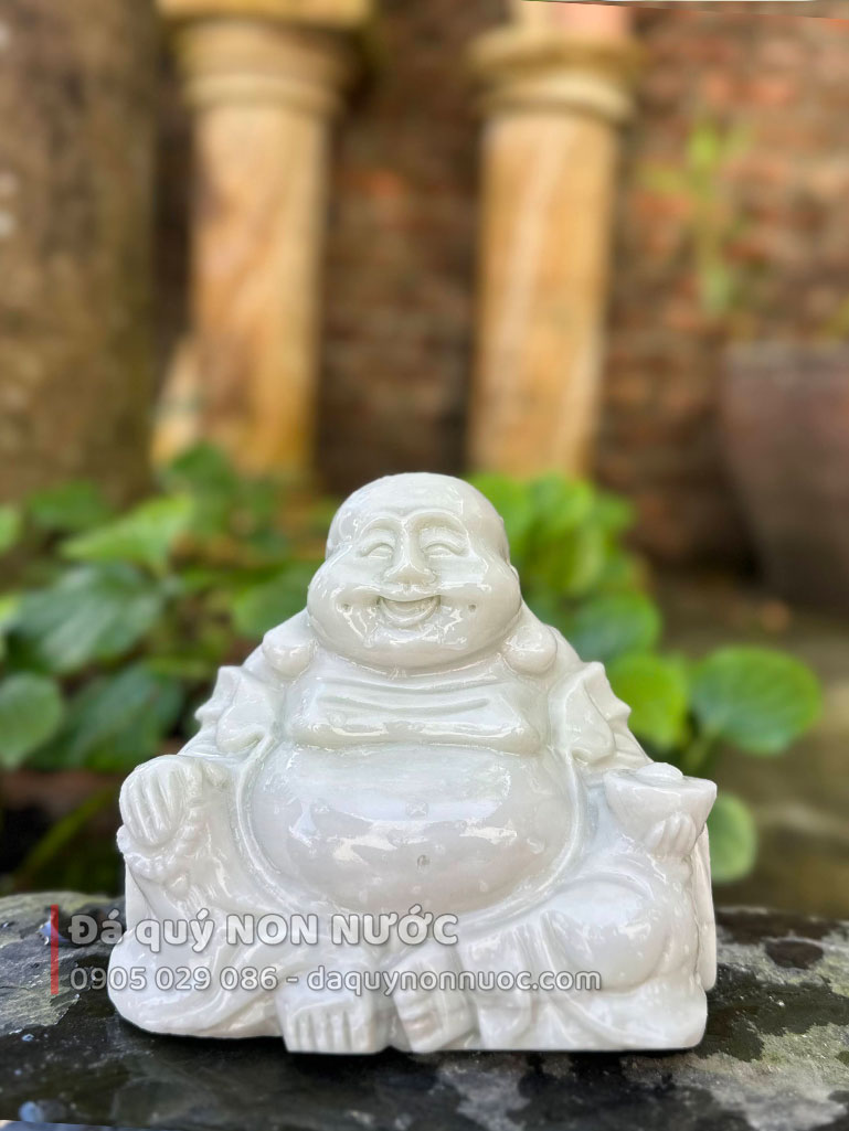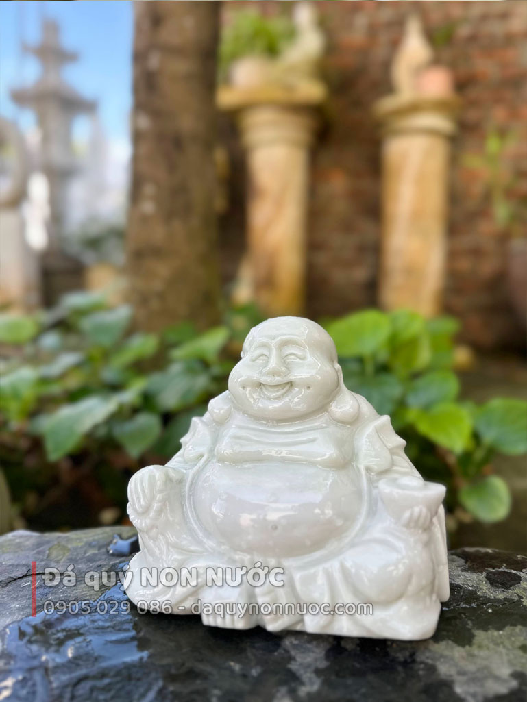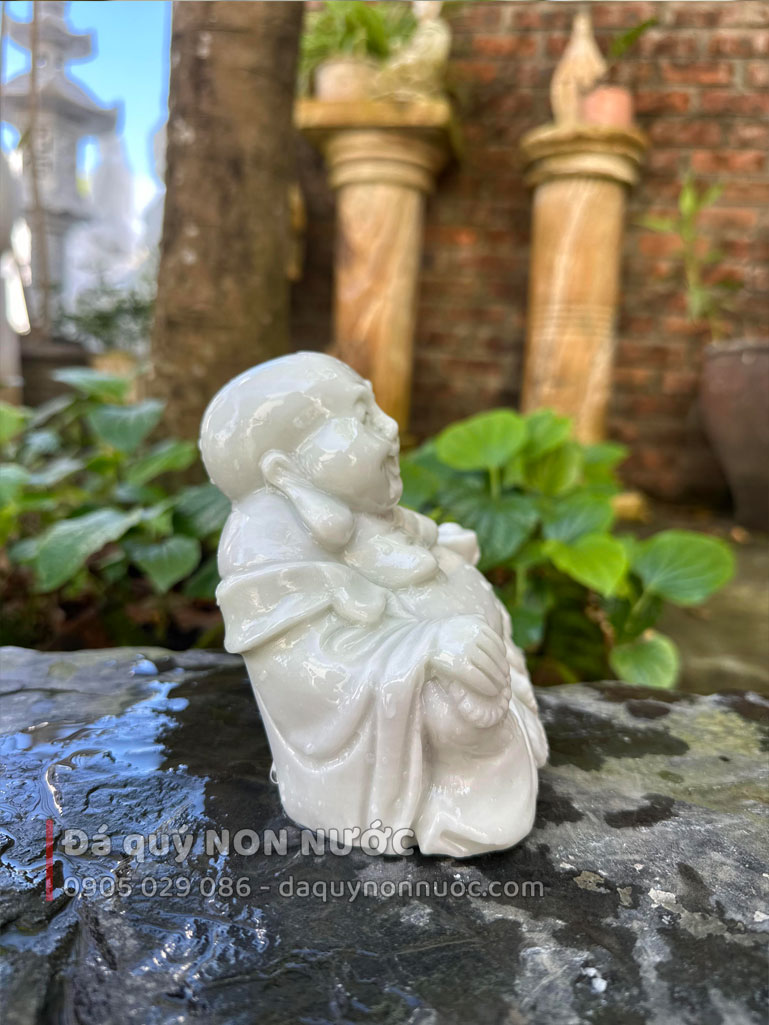 Sắc trắng của đá không chỉ tôn lên vẻ đẹp thanh lịch mà còn là biểu tượng của sự thuần khiết. Tượng di lặc nhỏ được chế tác từ đá tự nhiên nguyên khối, đảm bảo độ bền vượt thời gian. Sự tỉ mỉ của các nghệ nhân làng nghề Đá quý NON NƯỚC thể hiện rõ qua từng nếp áo, khuôn mặt phúc hậu và dáng ngồi thư thái. Sản phẩm sản xuất trực tiếp tại làng nghề, nơi mỗi tác phẩm được chăm chút để giữ trọn vẹn hồn cốt của đá, mang lại cảm giác dễ chịu cho người ngắm nhìn và tạo sự hài hòa cho không gian xung quanh.