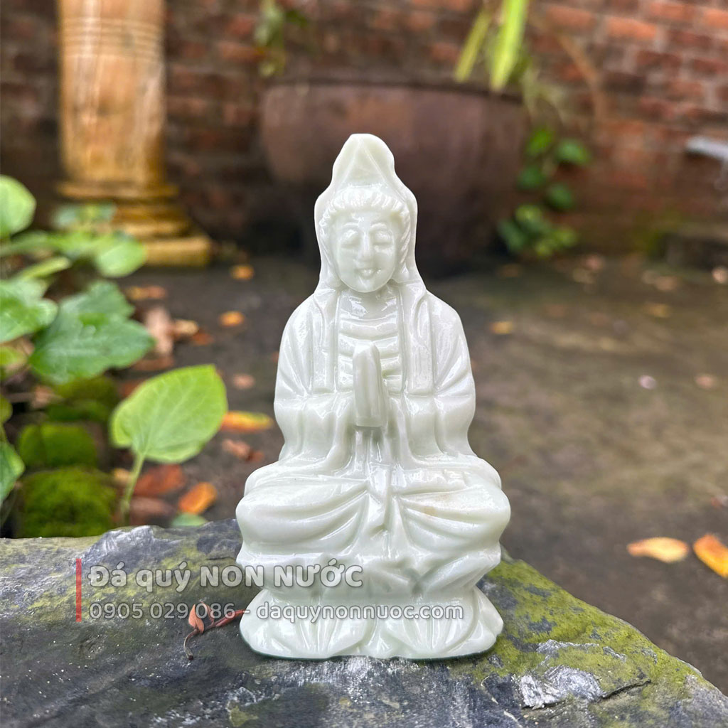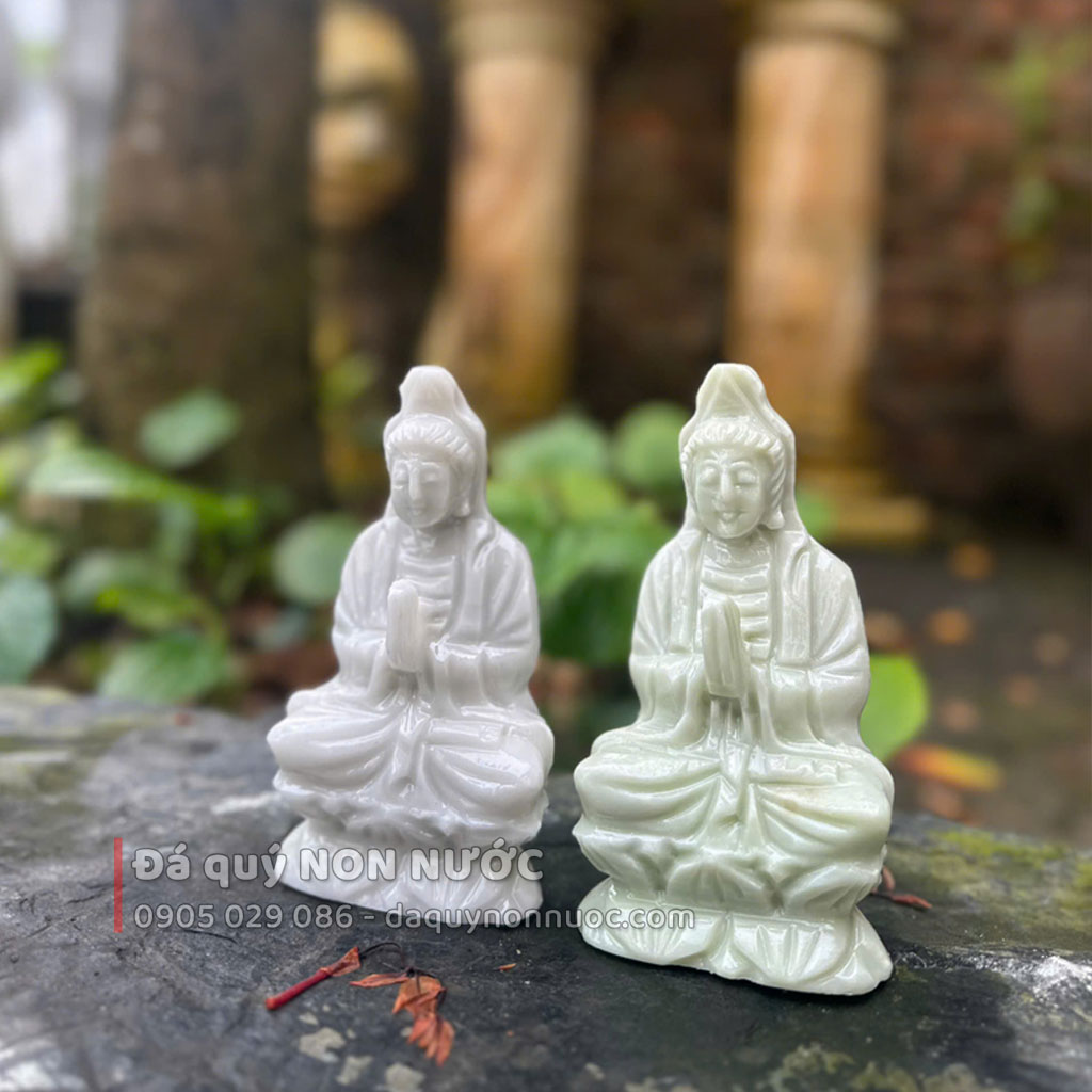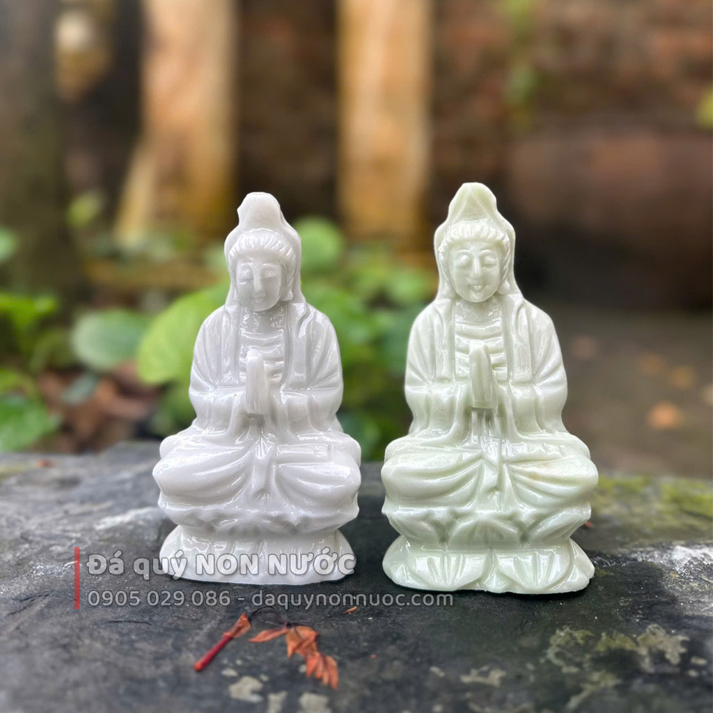 Đá trắng xanh với vân màu tự nhiên chạy dọc thớ đá tạo nên vẻ đẹp độc bản mà không loại vật liệu nhân tạo nào mô phỏng được. Mỗi tượng Phật Quan Âm để bàn bằng đá trắng xanh là một tác phẩm duy nhất – không chiếc nào giống chiếc nào.