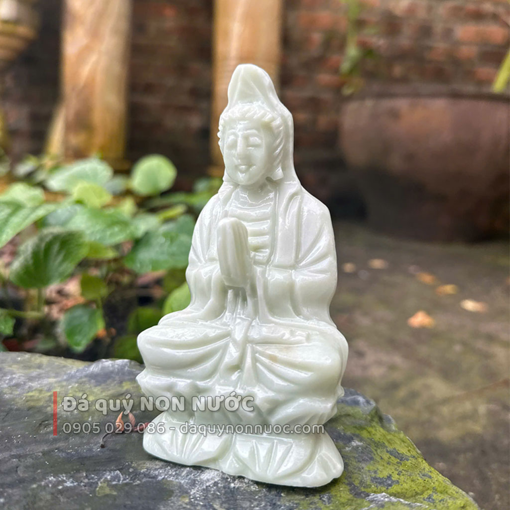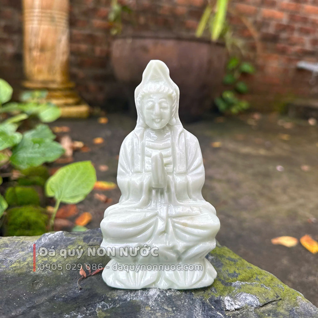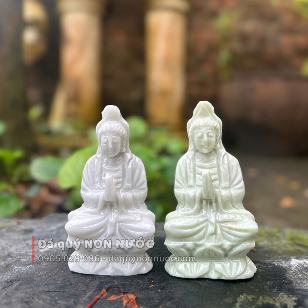 Đá trắng xanh với vân màu tự nhiên chạy dọc thớ đá tạo nên vẻ đẹp độc bản mà không loại vật liệu nhân tạo nào mô phỏng được. Mỗi tượng Phật Quan Âm để bàn bằng đá trắng xanh là một tác phẩm duy nhất – không chiếc nào giống chiếc nào.