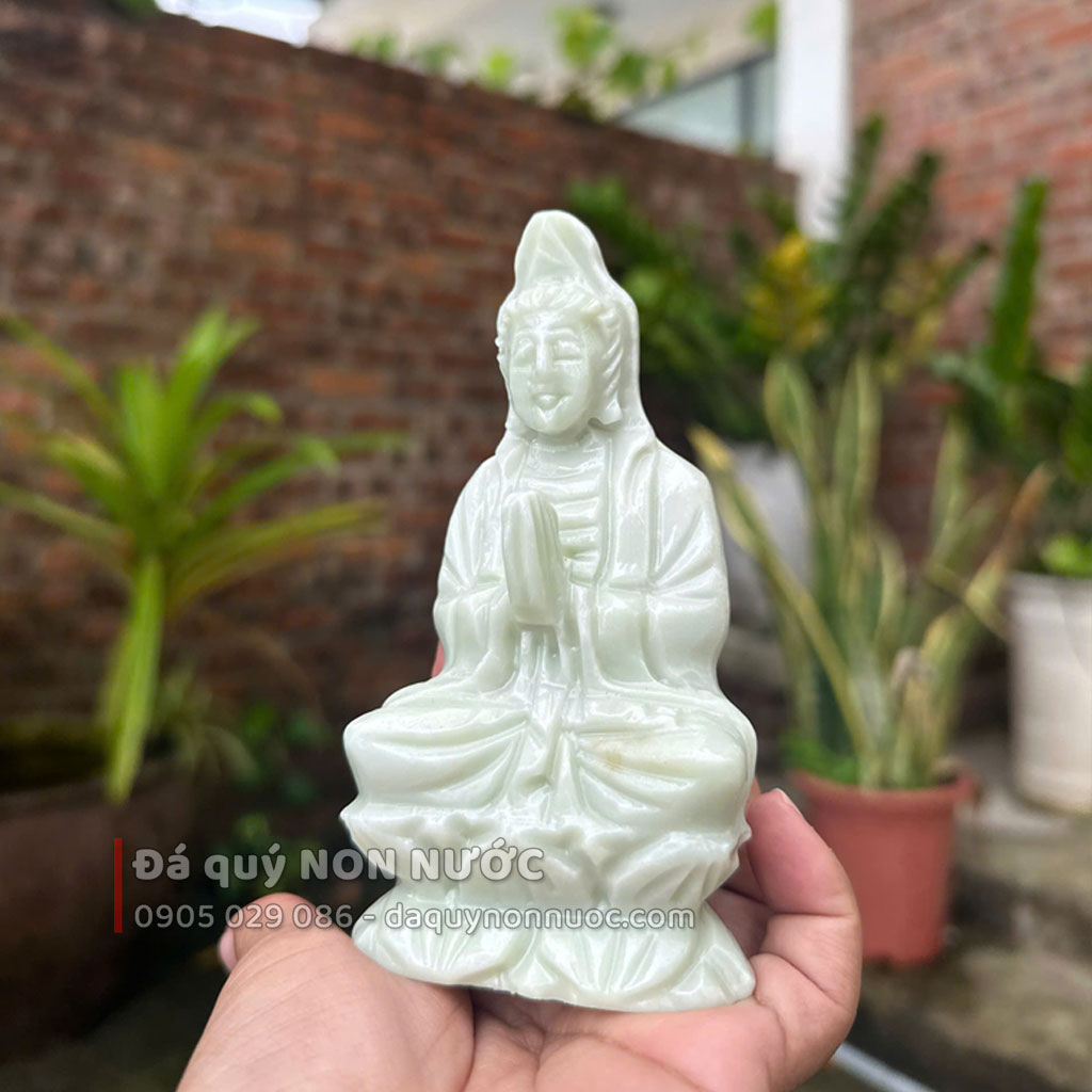 Toàn bộ sản phẩm tại Đá quý NON NƯỚC được điêu khắc thủ công bởi nghệ nhân làng đá Non Nước, Ngũ Hành Sơn. Với tượng nhỏ 12cm, yêu cầu về độ tỉ mỉ còn cao hơn – từng nét mặt, nếp áo, đường tay đều phải chuẩn chỉnh trong không gian rất nhỏ. Đây là thử thách mà chỉ nghệ nhân lành nghề thực sự mới làm được.