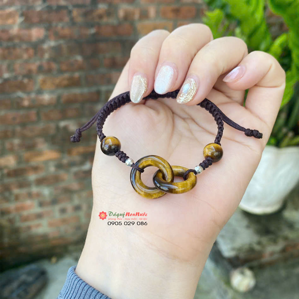 Vòng đeo tay hai vòng tròn lồng vào nhau được thiết kế độc đáo với hình tượng hai vòng tròn gắn kết, tượng trưng cho sự hòa hợp, đồng hành và tình cảm gắn bó bền lâu. Vật liệu chính là đá mắt hổ tự nhiên, kết hợp với dây đan thủ công freesize, vừa thoải mái, vừa mang vẻ ngoài gần gũi nhưng đầy cá tính.